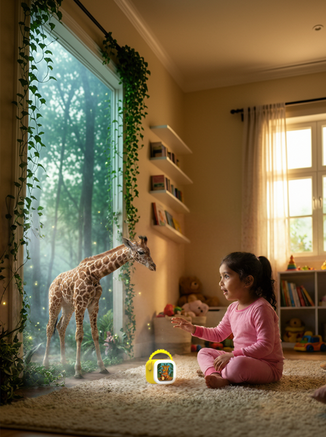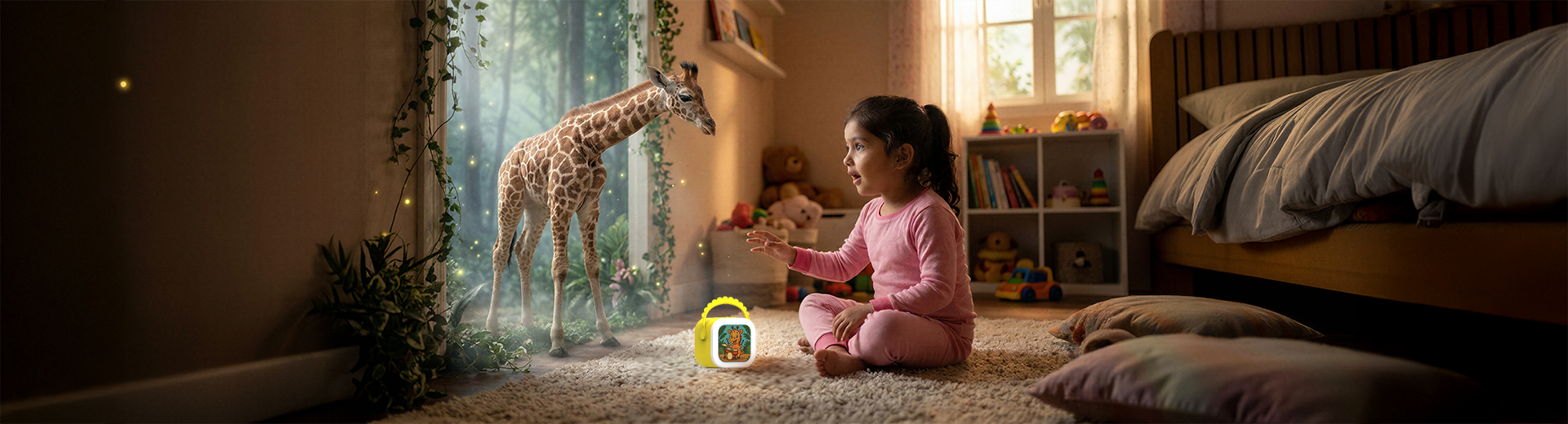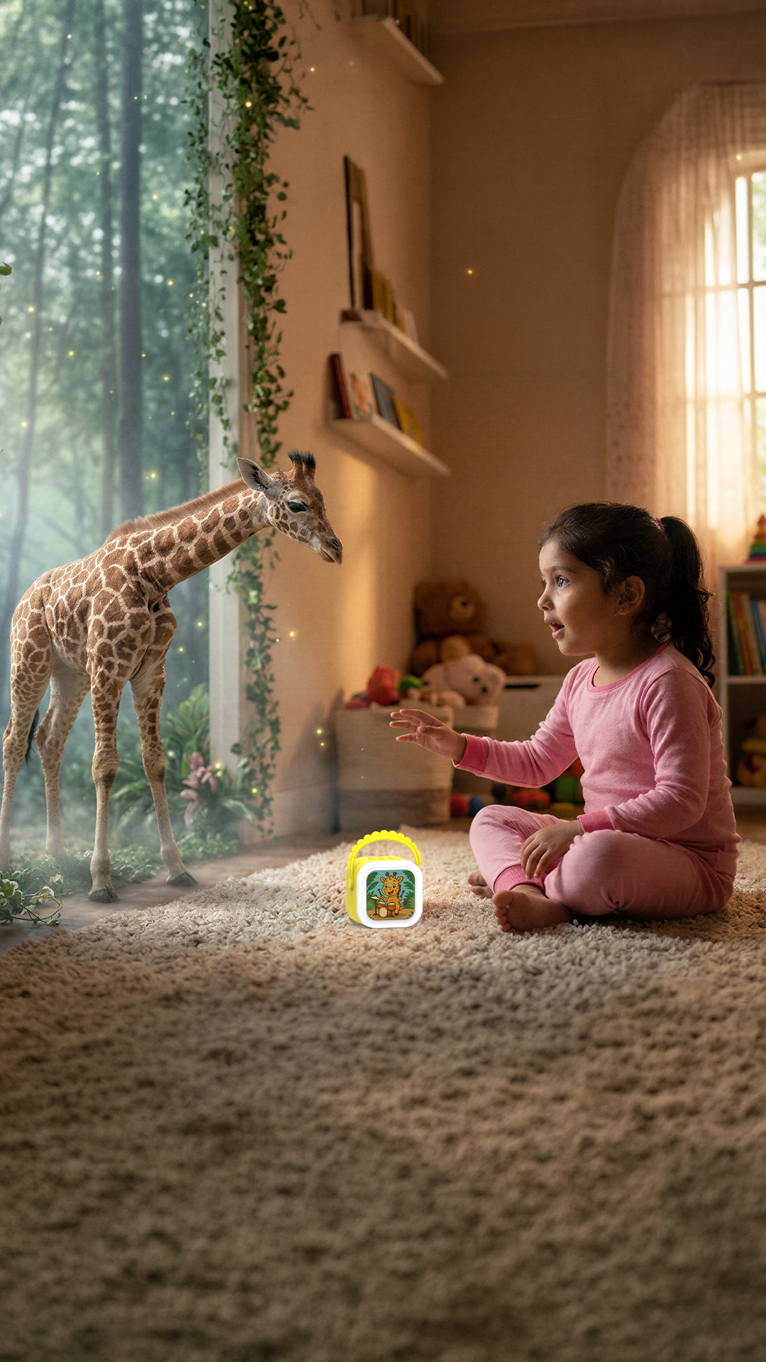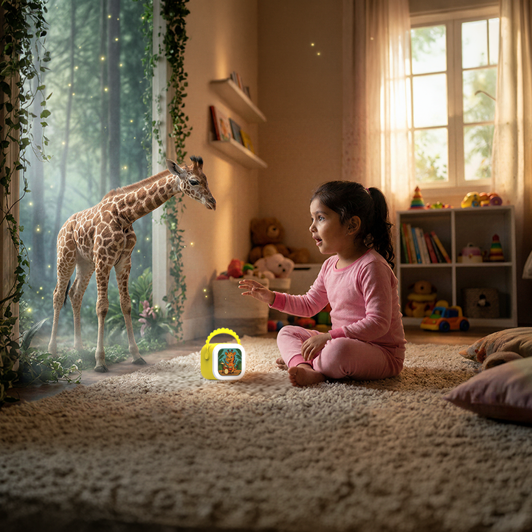 The Tiger, Giraffe and Dragon variants gently support younger kids (3–5 years) with musical rhymes and early learning stories, while the Unicorn and Dino variants spark curiosity in older children (6–10 years) through adventure-filled stories, layered characters, and rich plots.