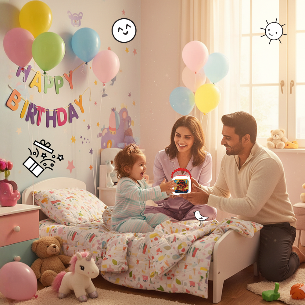 The Storybox Mini comes preloaded with 200+ stories and rhymes, carefully curated by child development experts, teachers, and psychologists to nurture imagination, vocabulary, and emotional growth. The Tiger and Dragon variants (for ages 3–5) feature musical rhymes and early learning tales that make screen-free play both fun and educational. The Unicorn and Dino variants (for ages 6–10) include adventure-filled stories with layered characters and rich plots that spark curiosity and creativity. Every story, song, and rhyme is chosen with purpose to make listening a joyful, meaningful part of every child’s day.