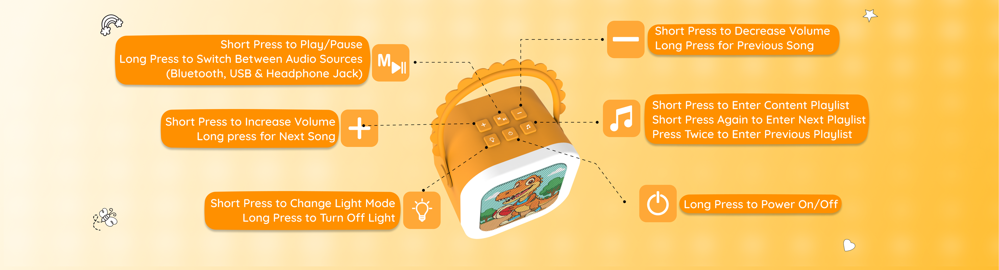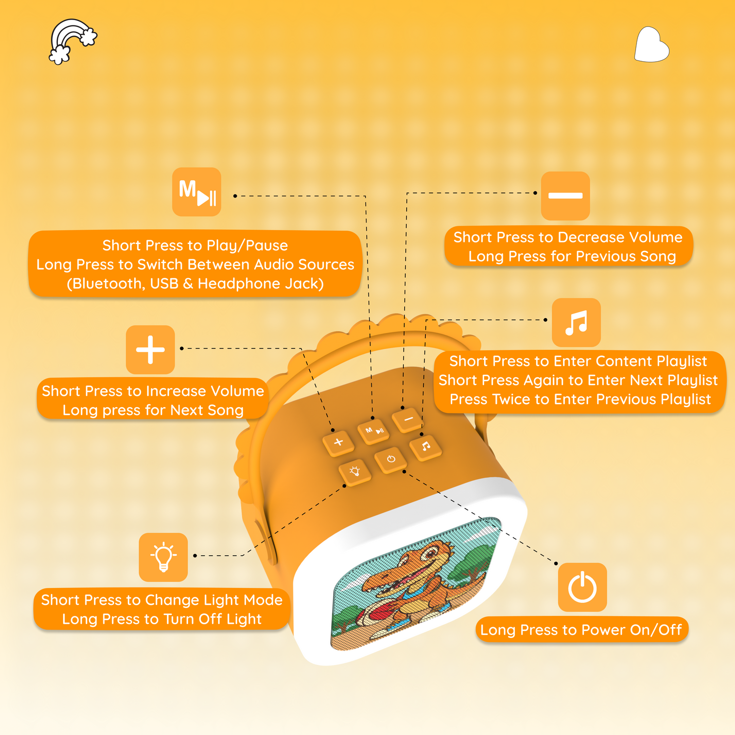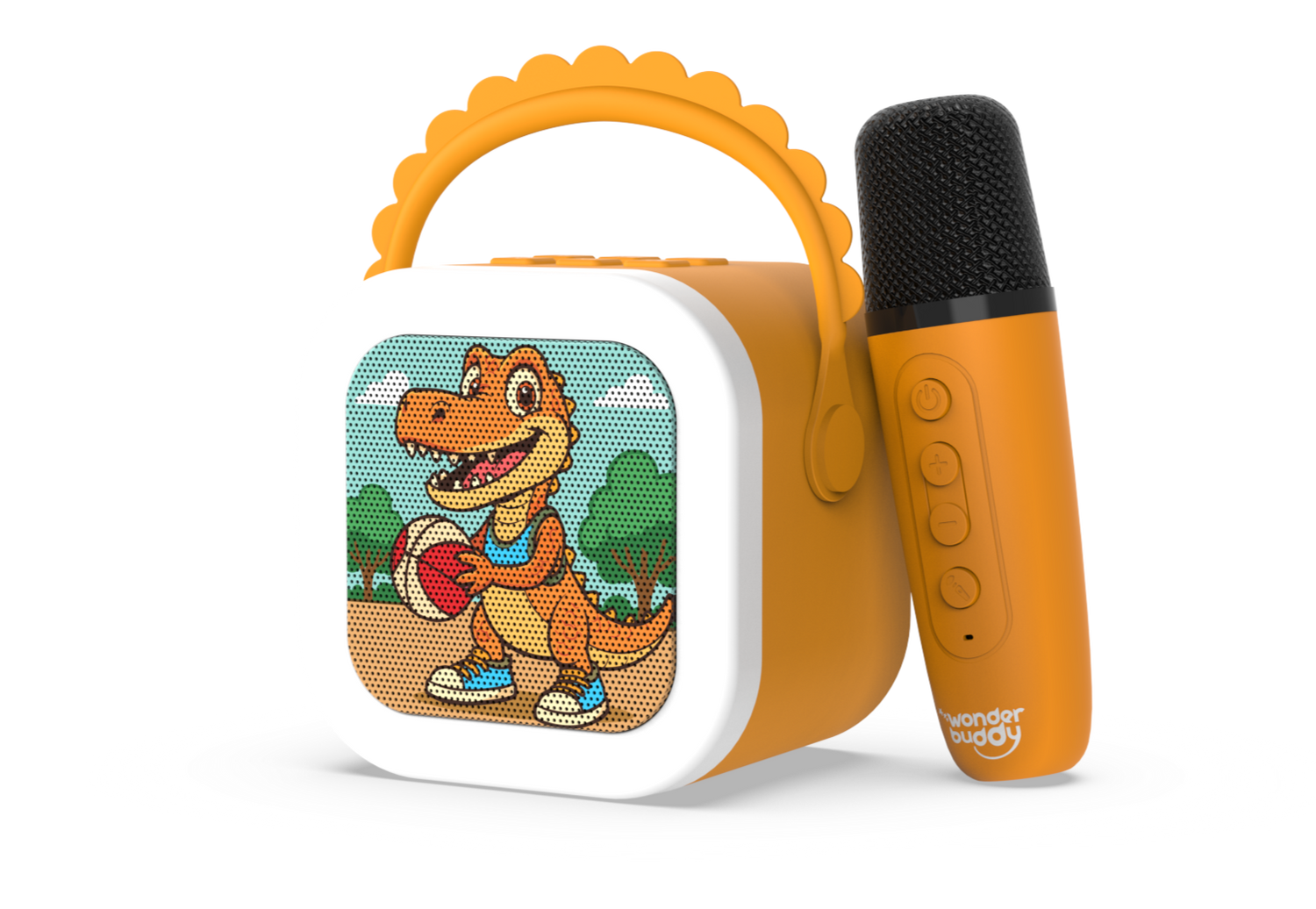 The StoryBox Mini comes with a C-type charging cable, a user manual, and a playlist booklet. The Dino, Unicorn, and Dragon variants come with a karaoke mic to make sing-along time even more fun!