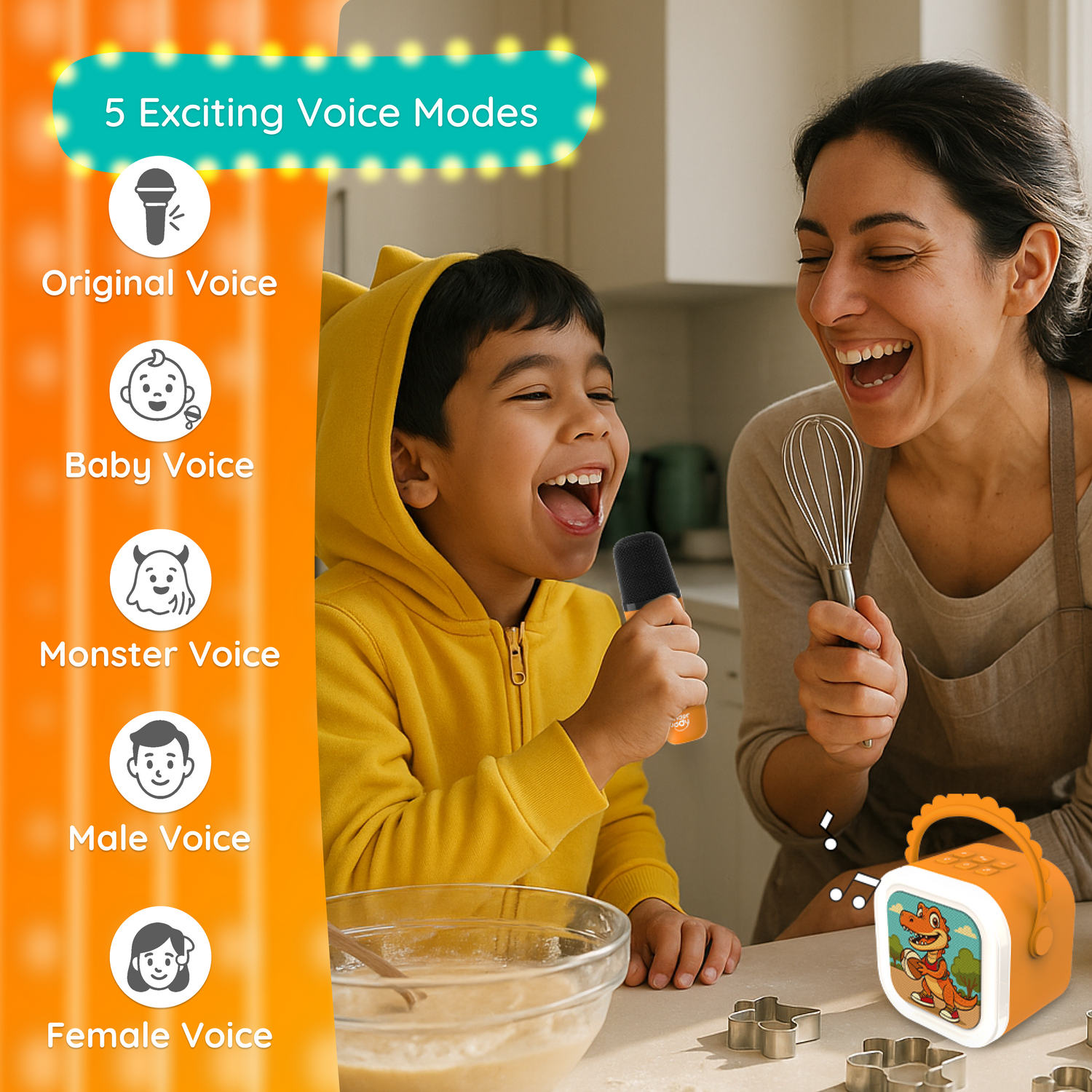 Stomp, sing, and shine with Tiny the Dino stories, songs & your own karaoke mic!