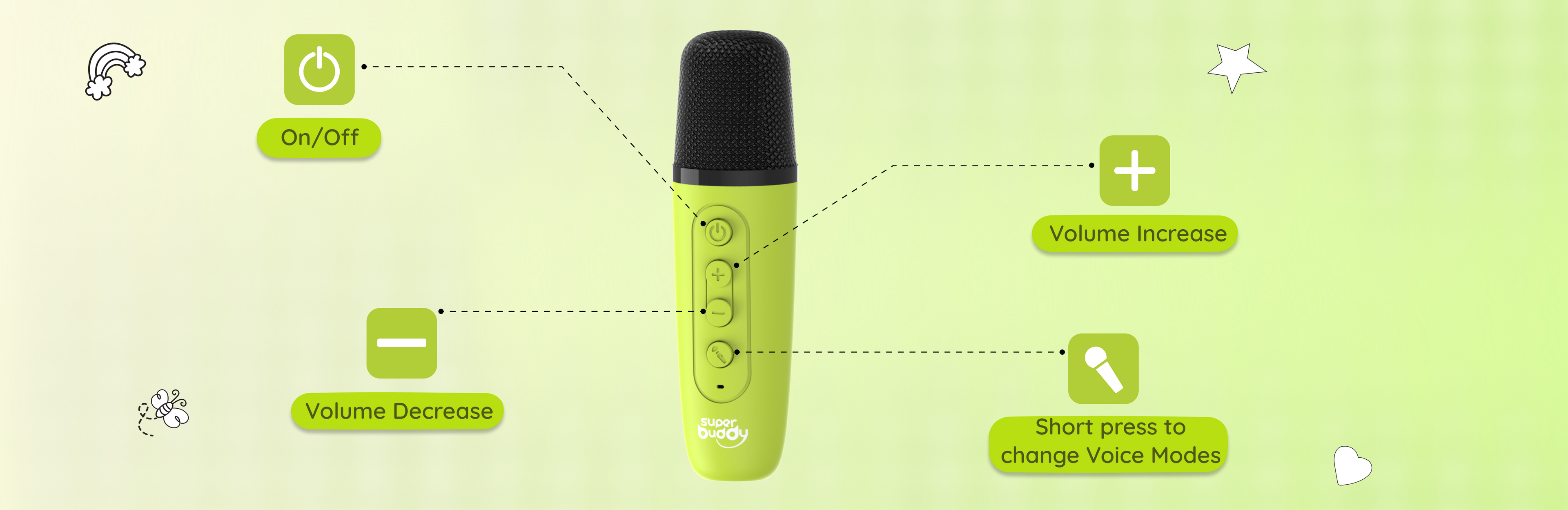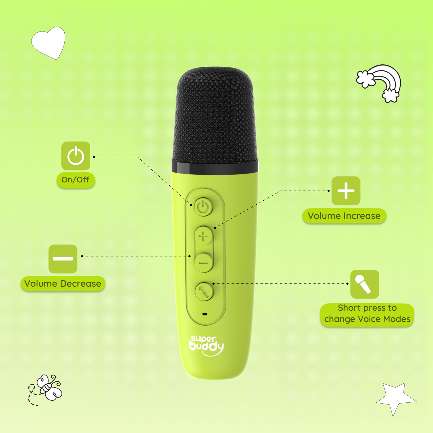 The StoryBox Mini comes with a C-type charging cable, a user manual, and a playlist booklet. The Dino, Unicorn, and Dragon variants come with a karaoke mic to make sing-along time even more fun!