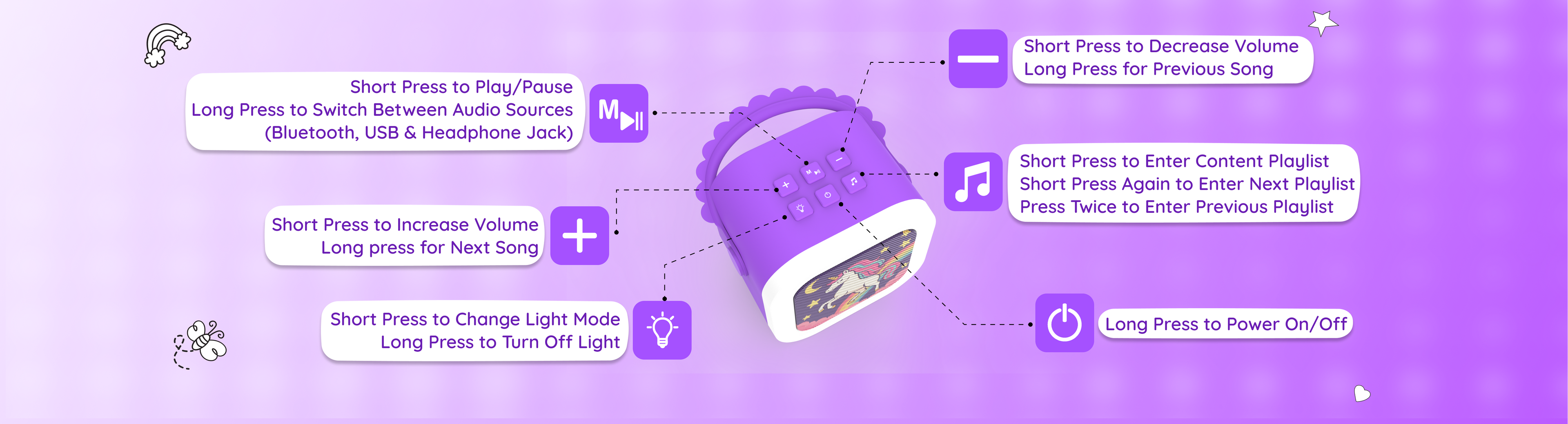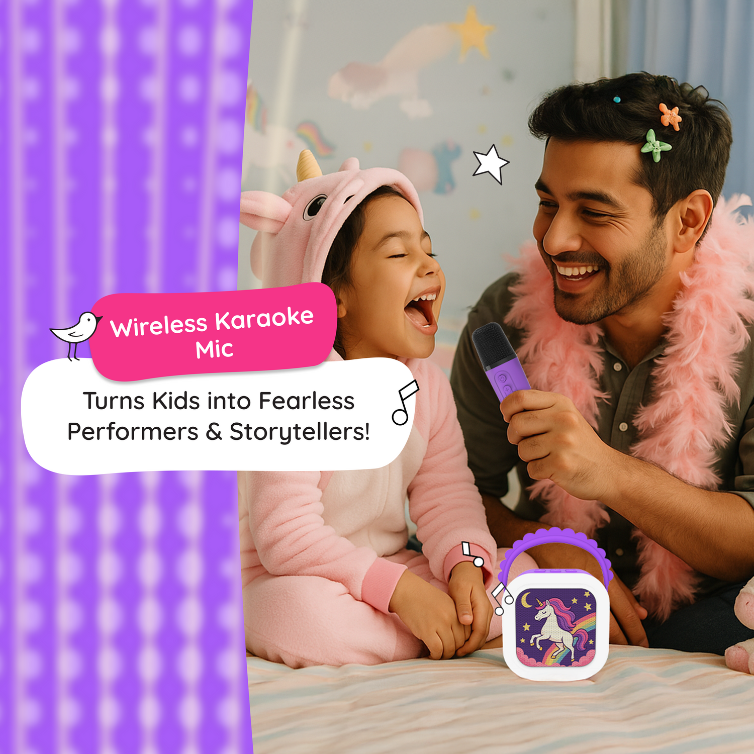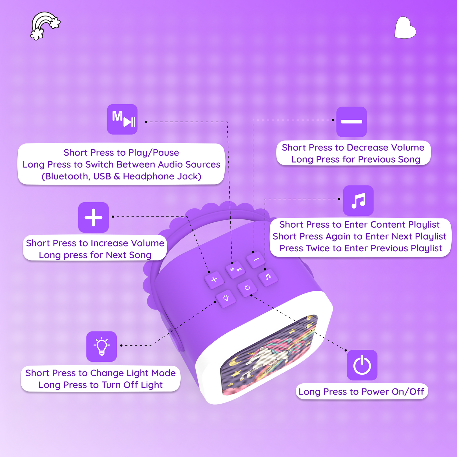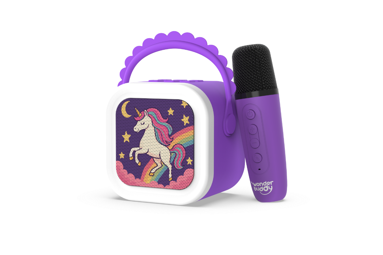 The StoryBox Mini comes with a C-type charging cable, a user manual, and a playlist booklet. The Dino, Unicorn, and Dragon variants come with a karaoke mic to make sing-along time even more fun!
