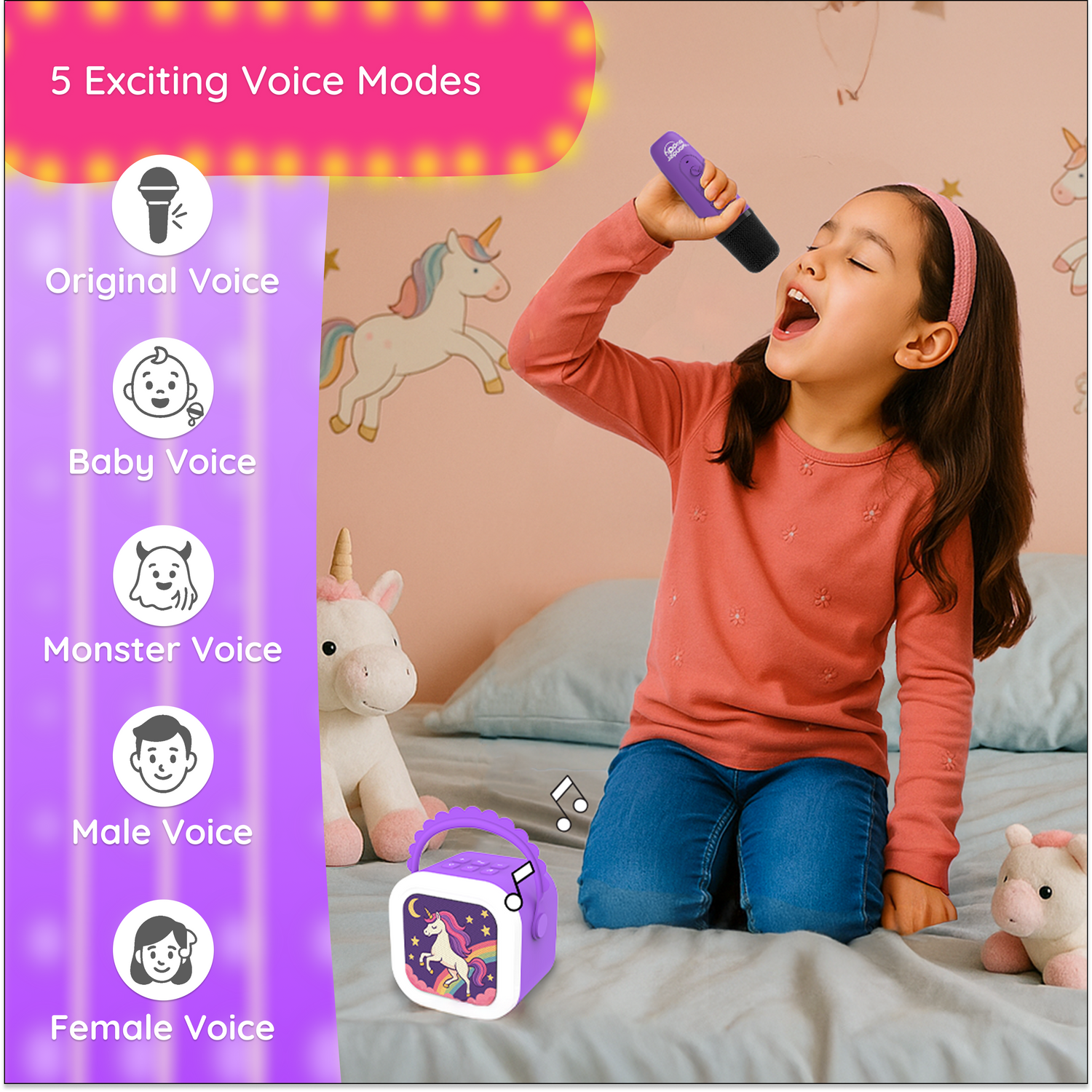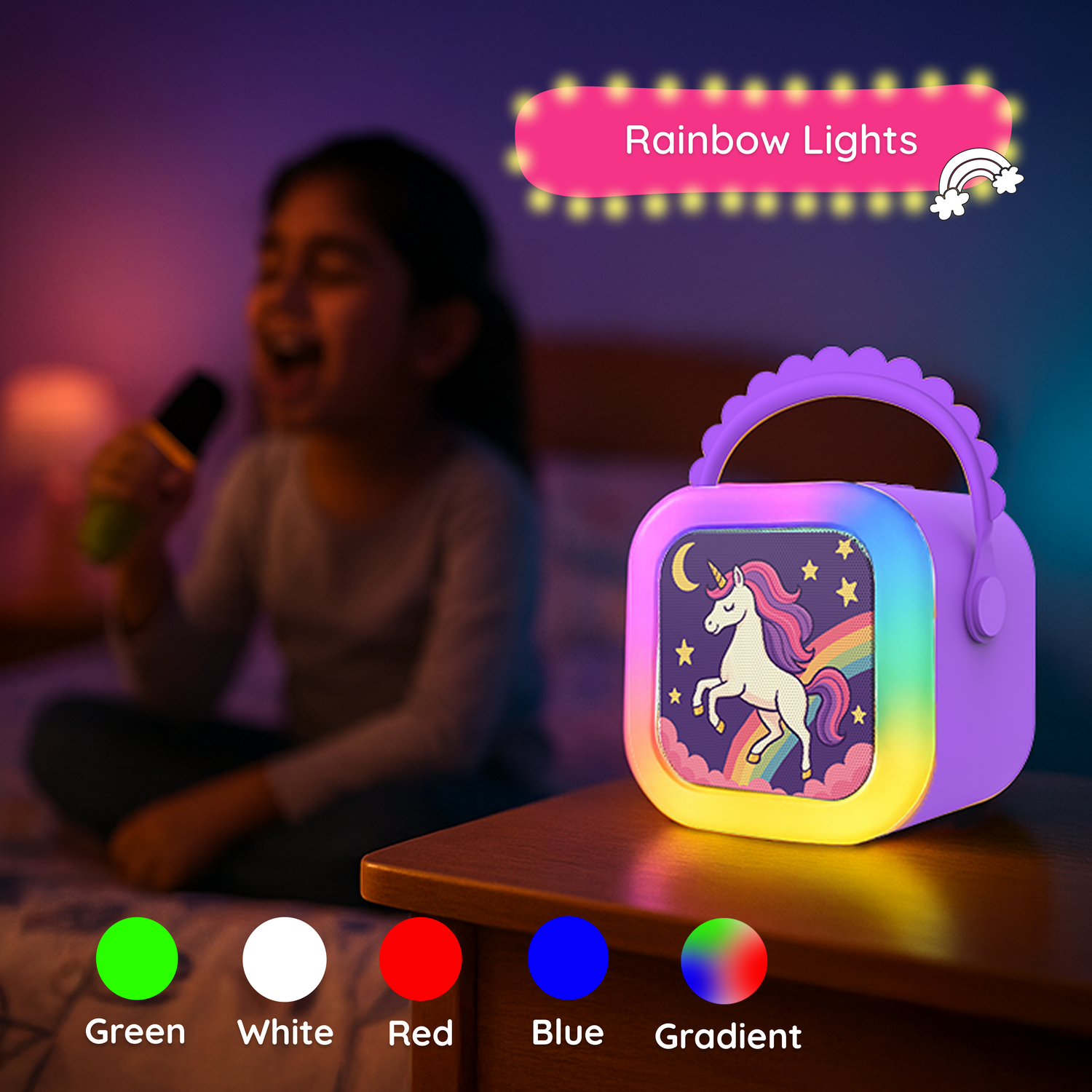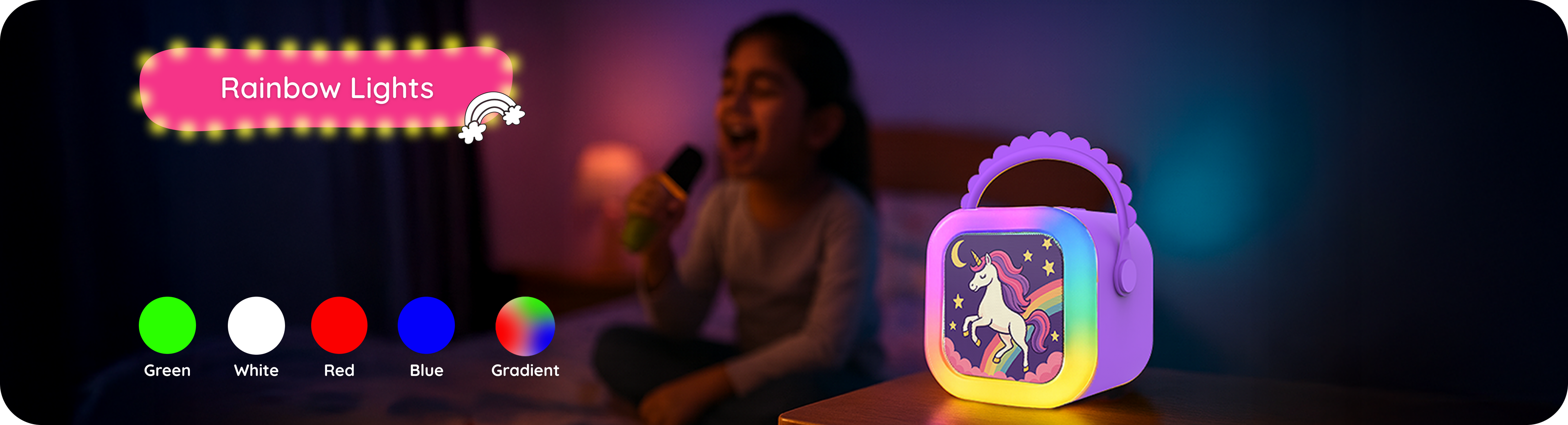 The StoryBox Mini comes with a C-type charging cable, a user manual, and a playlist booklet. The Dino, Unicorn, and Dragon variants come with a karaoke mic to make sing-along time even more fun!
